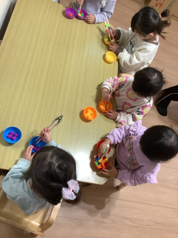 2歳児さんは上手にデコレーションボールをお箸で掴み