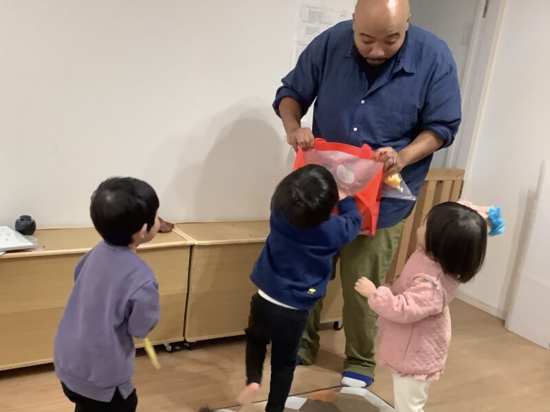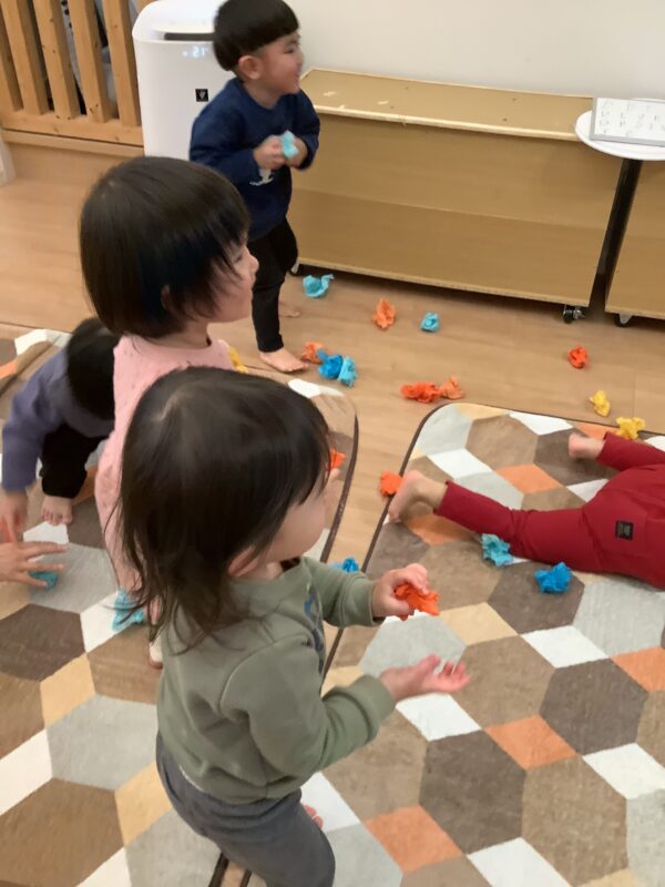 花紙を丸めた物を投げて🫳⤵️先生の持っている袋の中に入れる遊びでは